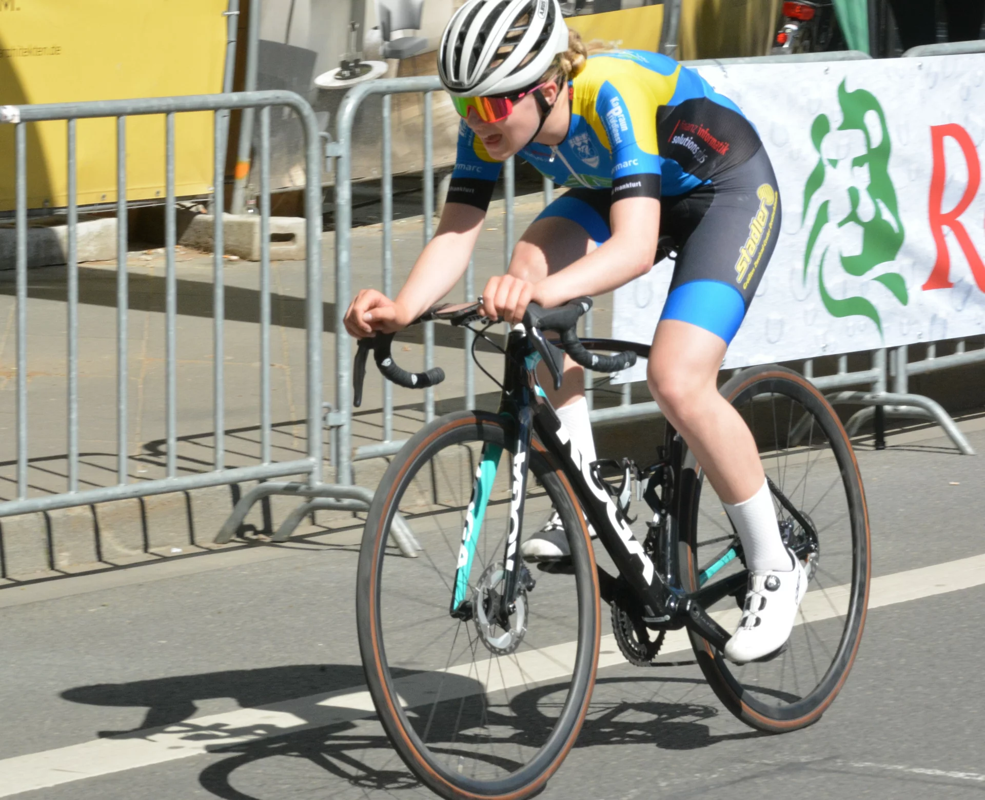 27. Juli 2025. - Das traditionsreiche Rennen „Rund um das Stadttheater“ in Gießen war in diesem Jahr Schauplatz der Rad-Bundesliga der Frauen. Auf dem nur 800 Meter langen Rundkurs wurde das Feld der Teilnehmerinnen aus Sicherheitsgründen über zwei Qualifikationsrennen geteilt. Für Liv Hackbarth (Team Siena Garden Racing) ging es also darum, im Temporennen zu punkten, um in das A-Finale zu kommen. Dieses Vorhaben gelang, was ihr den begehrten Startplatz bescherte. Im Finale lief es ebenfalls sehr gut, so dass mit Platz 15 das bisher beste Ergebnis in ihrer ersten Bundesligasaison herauskam. Gute Resultate gab es auch für Alexander Woweries und Niklas Weckel, die in der U13 die Plätze 3 und 4 belegten.