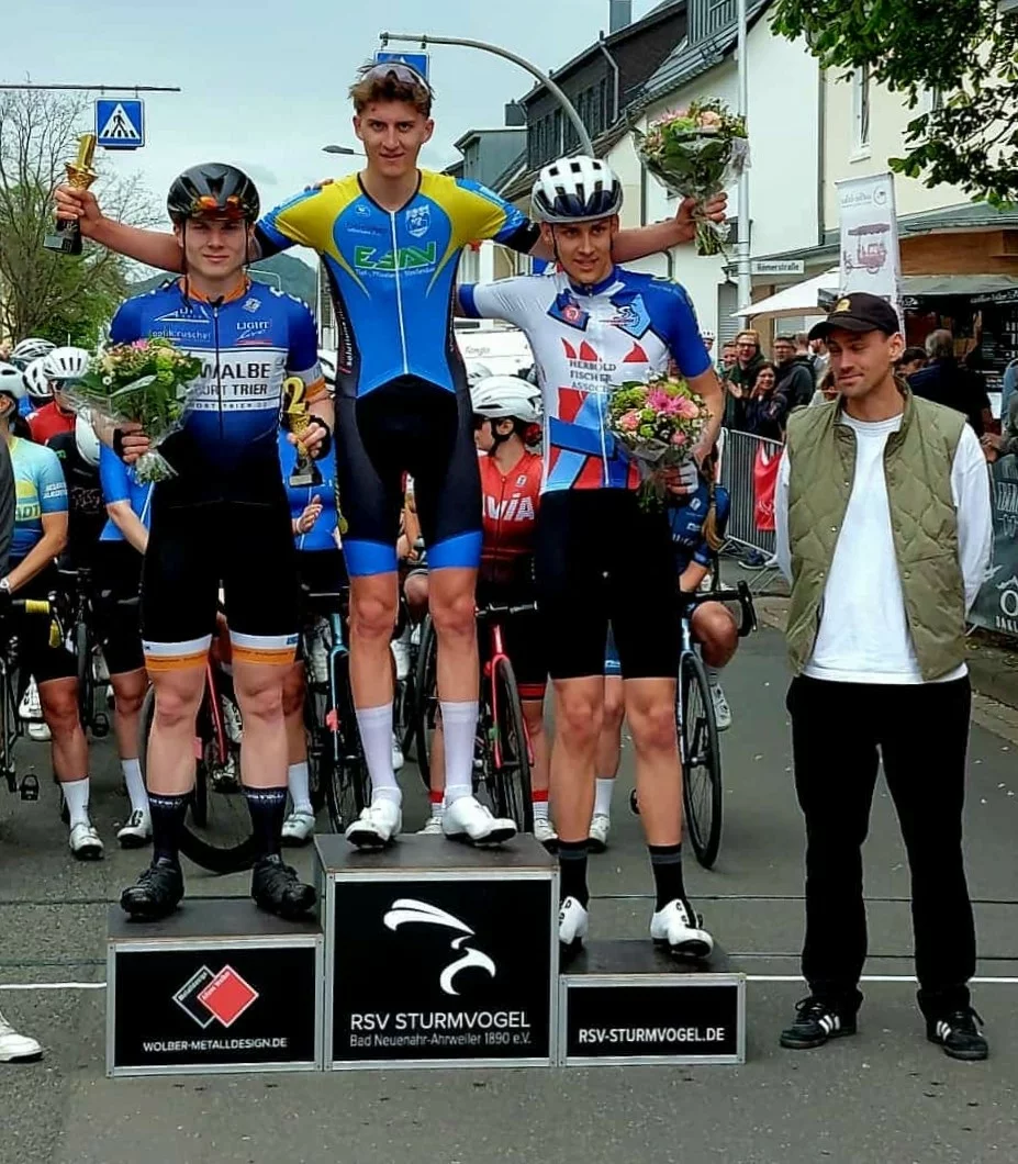 21. April 2025. – Auch beim „Großen Osterpreis“ in Ahrweiler konnten die Sportlerinnen und Sportler der RSG Frankfurt wieder mit guten Resultaten überzeugen. So gewann Bjarne Heim (Foto rechts) das Rennen der Junioren U19 während seine Schwester im Wettbewerb der U15 ebenfalls die gesamte (männliche) Konkurrenz hinter sich ließ und Siegerin ins Ziel kam. Im Rennen der Elite zeigte Fabio Dias erneut seine Sprintqualitäten und belegte Platz 2. Eine starke Vorstellung lieferte auch Liv Hackbarth, die im Rennen der Frauen den dritten Platz belegte. Weitere Platzierungen holten Theo Himmelreich in der U19 (5.), Rasmus Heim in der U13 (9.) sowie Linus Adam (15.) und Jadon Siebert (20.) in der Elite.