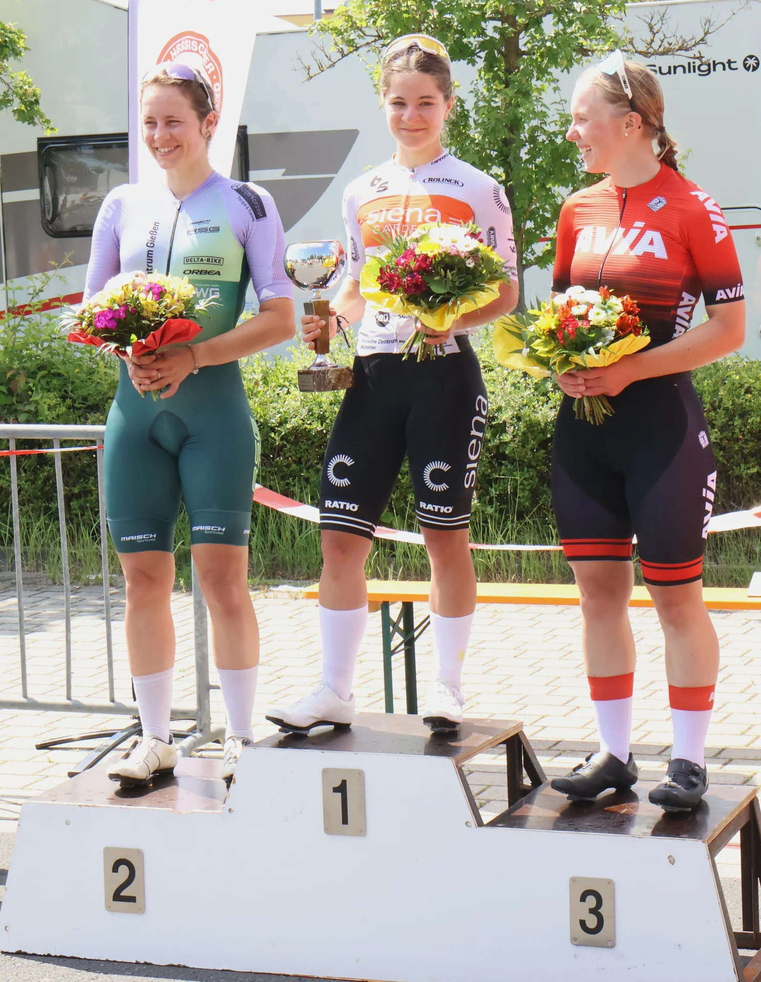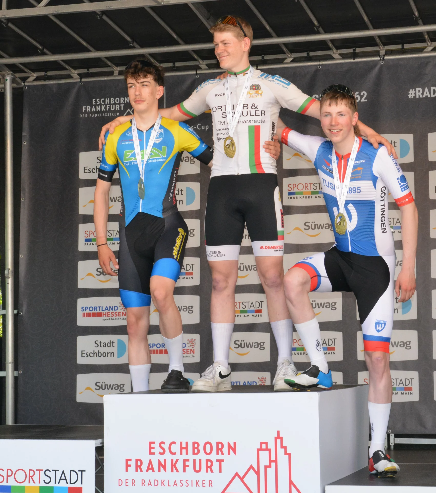 3.Mai 2025. – Die Sportlerinnen und Sportler der RSG Frankfurt haben bei den hessischen Landesmeisterschaften auf der Straße im thüringischen Leubingen erneut eine glänzende Bilanz abgeliefert und zehn Medaillen eingesammelt. Damit war die RSG der mit Abstand erfolgreichste Verein. Einen starken Auftritt zeigten Liv Hackbarth und Elena Holl, die bei den Frauen nach schnellen 60 Kilometern einen Doppelsieg feierten. Zwei Medaillen gab es auch bei den Junioren, wo Emil Dossche souverän gewinnen konnten. Vincent Hahnkamp wurde bei seinem ersten Rennen durch einen leidenschaftlichen Endspurt noch mit Bronze belohnt. Eine echte Überraschung gab es im Rennen der U17, wo Moritz Dossche mit schnellen Beinen die beiden Favoriten knapp bezwingen konnte. Daniel Gutbier holte hier die Bronzemedaille. Ebenfalls im Sprint sicherte sich Nikolai Gessner den Titel in der gut besetzten U23. Philipp Freyer wurde Dritter in der Eliteklasse, Edouard Brocheny kam hier als Fünfter ins Ziel. In Hessen konkurrenzlos in der U15w ist Frida Heim, die aber den gemeinsamen Wettbewerb mit den thüringischen Schülerinnen gewinnen konnte. Auch Marharyta Yatsenko war in ihrer Altersklasse U17w in Hessen die einzige Teilnehmerin. In der U13 belegte Niklas Weckel den vierten Platz, Alexander Woweries und Rasmus Heim landeten auf den Plätzen 6 und 7. Weitere sehr gute Platzierungen gab es in der U23 für Linus Adam (5) Jadon Siebert (6) sowie in der U17 für Jan Nissel (5), Elias Krüger (6) und Alexandru Bischoff (7).